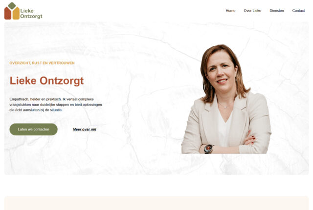 Voor haar nieuw opgestarte bedrijf Lieke Ontzorgt was de wens helder: een website met een warme uitstraling die tegelijkertijd zakelijk en professioneel blijft. Een plek waar vertrouwen en duidelijkheid centraal staan.